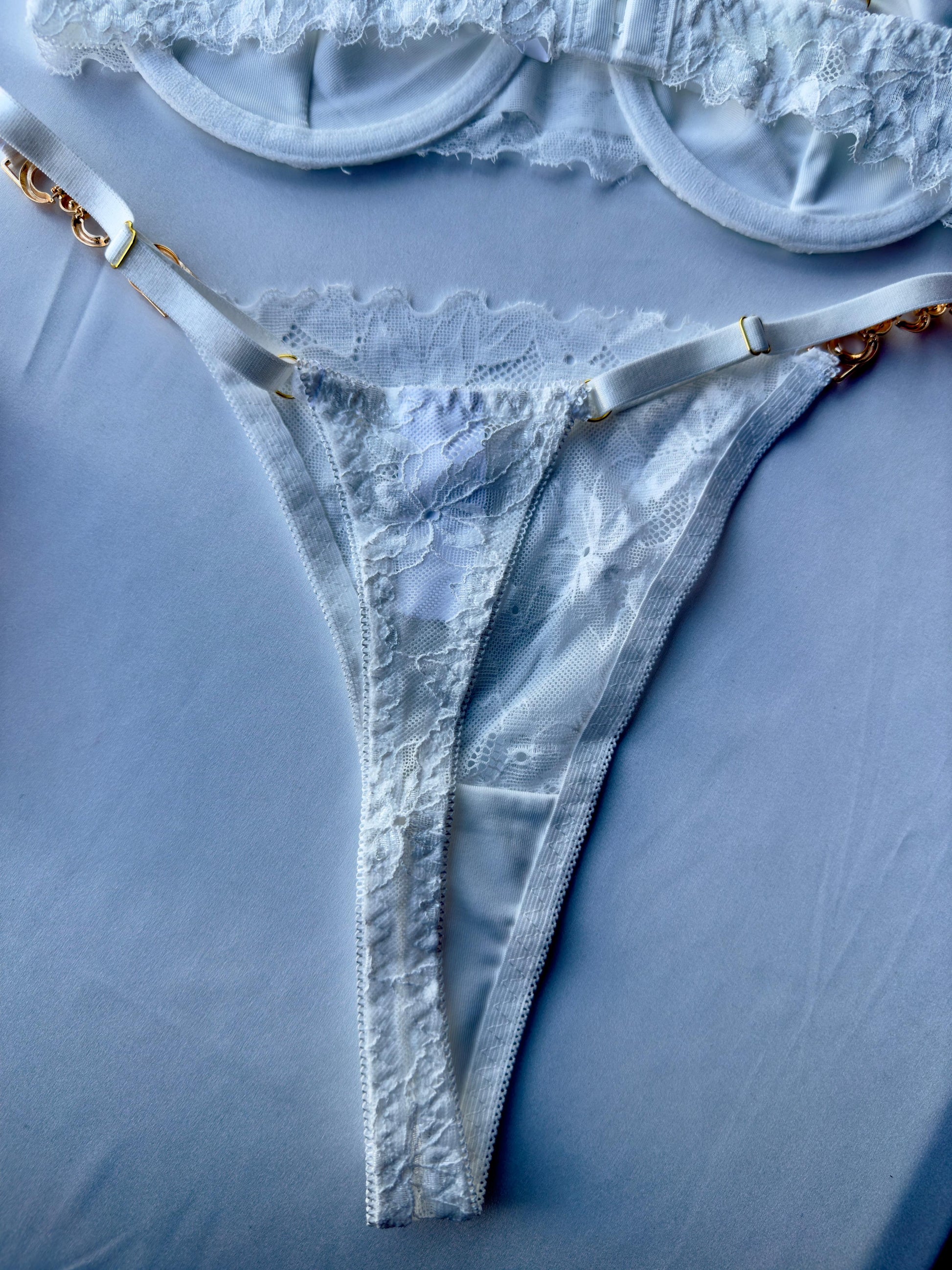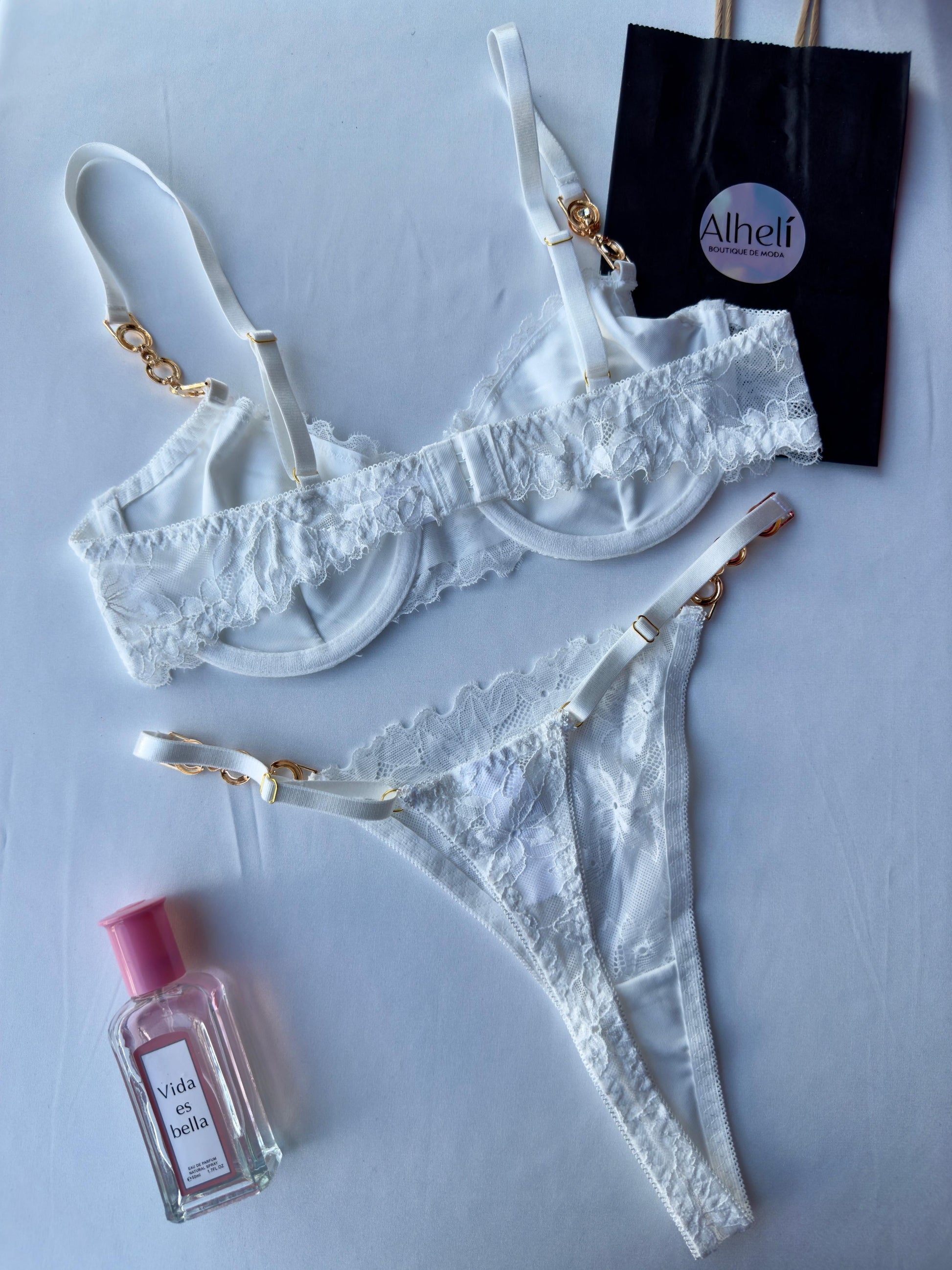 Lencería blanco con sujetador y braguita con aros y detalles de encaje floral y cadena