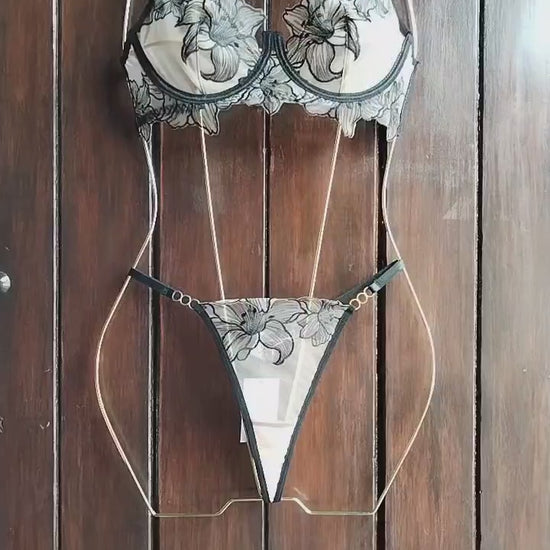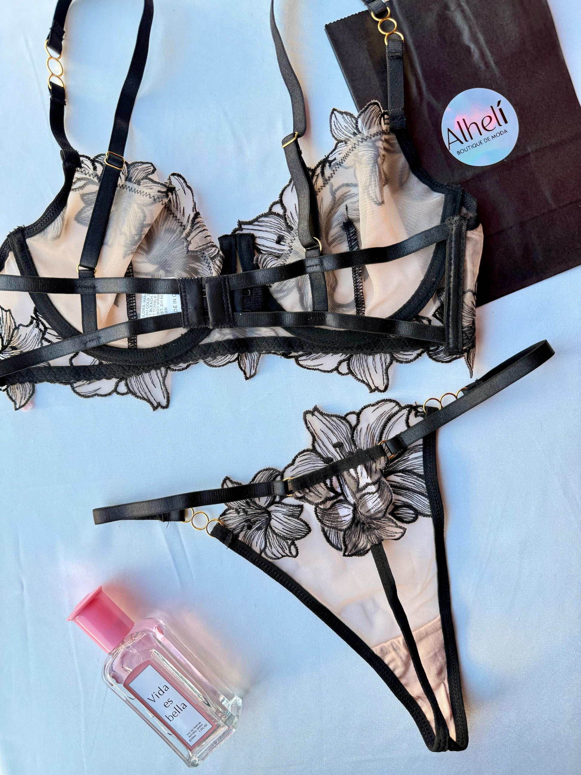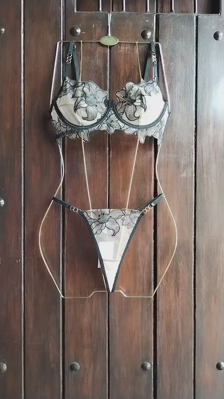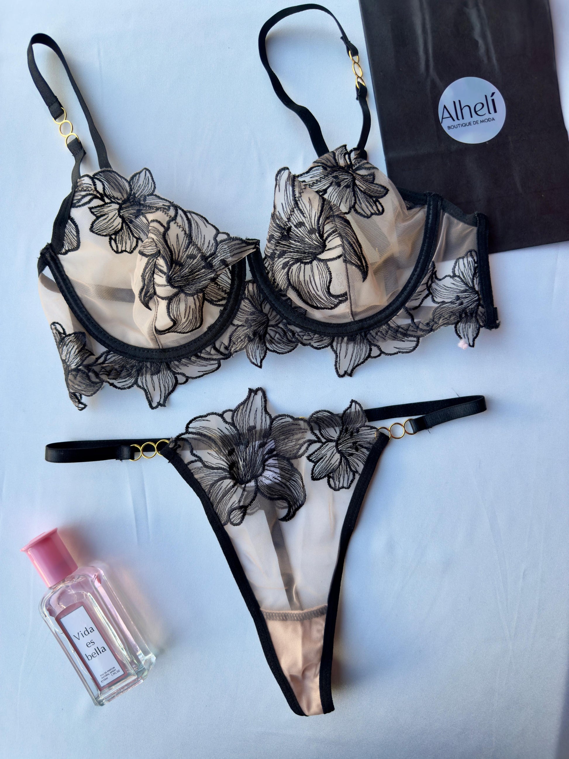 Lencería negra con bordado floral de malla