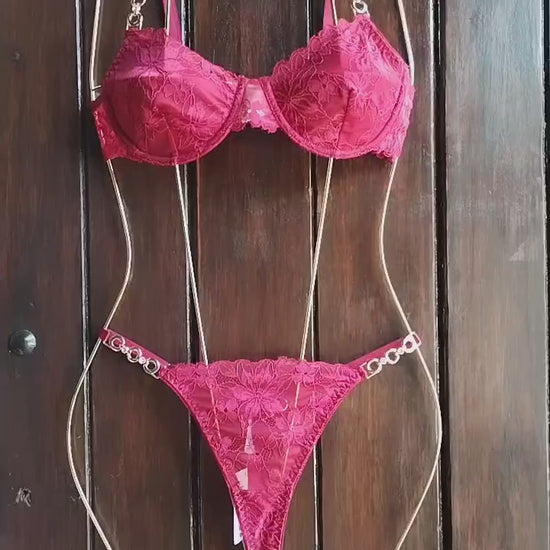 Lencería rojo con sujetador y braguita con aros y detalles de encaje floral y cadena