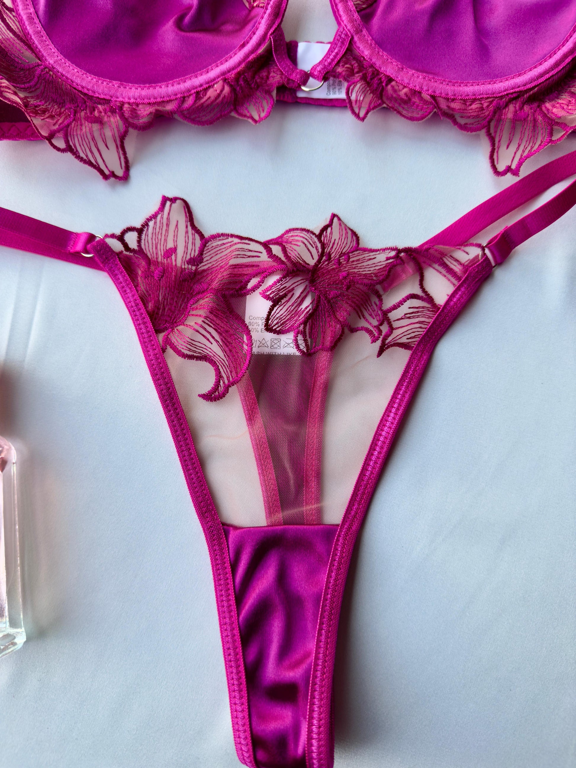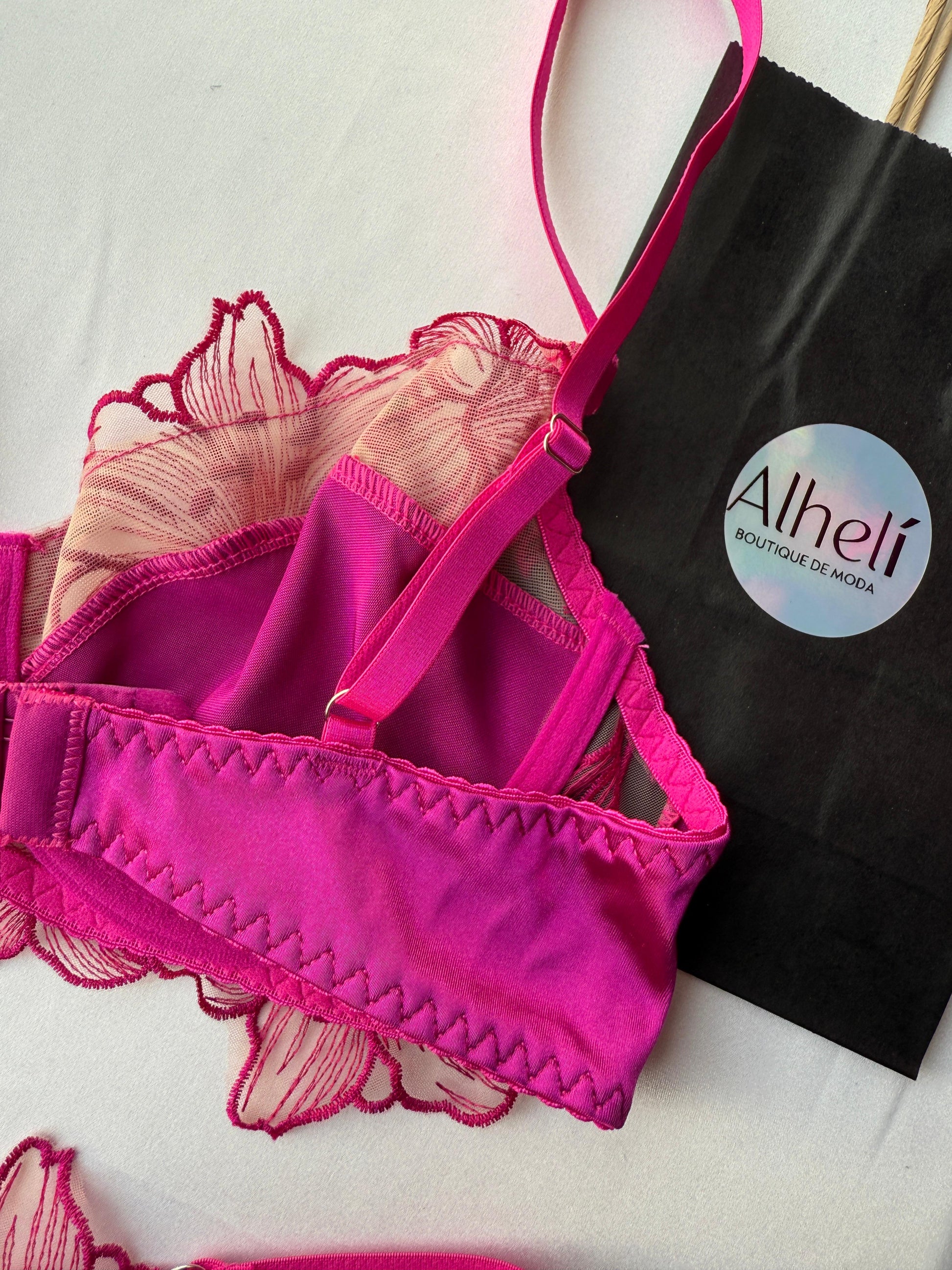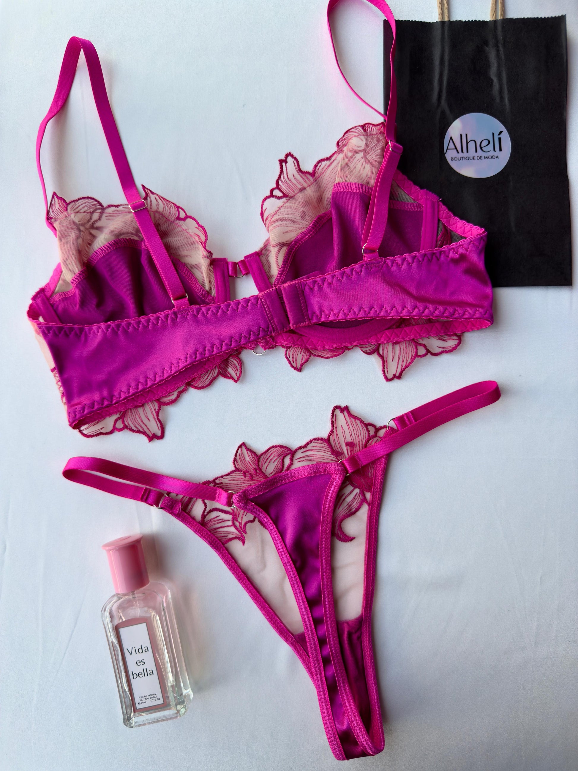 Lenceria rosado bloque de color calado y bordado 2 piezas